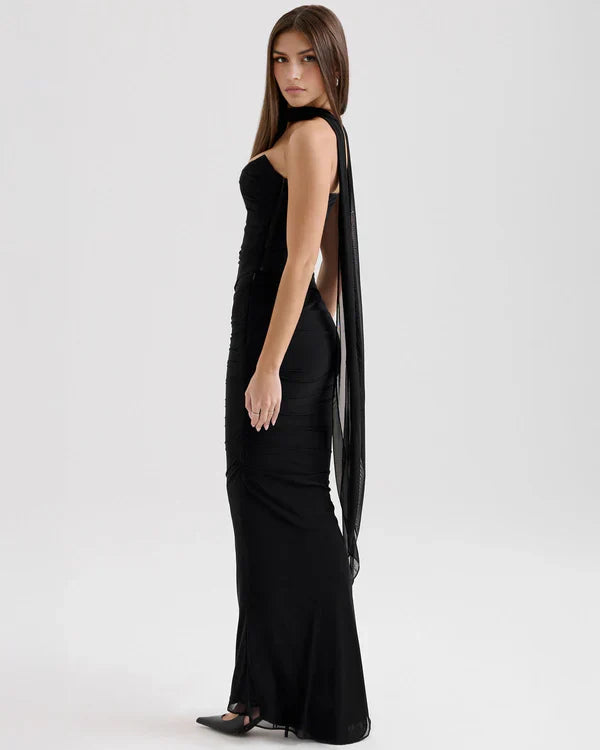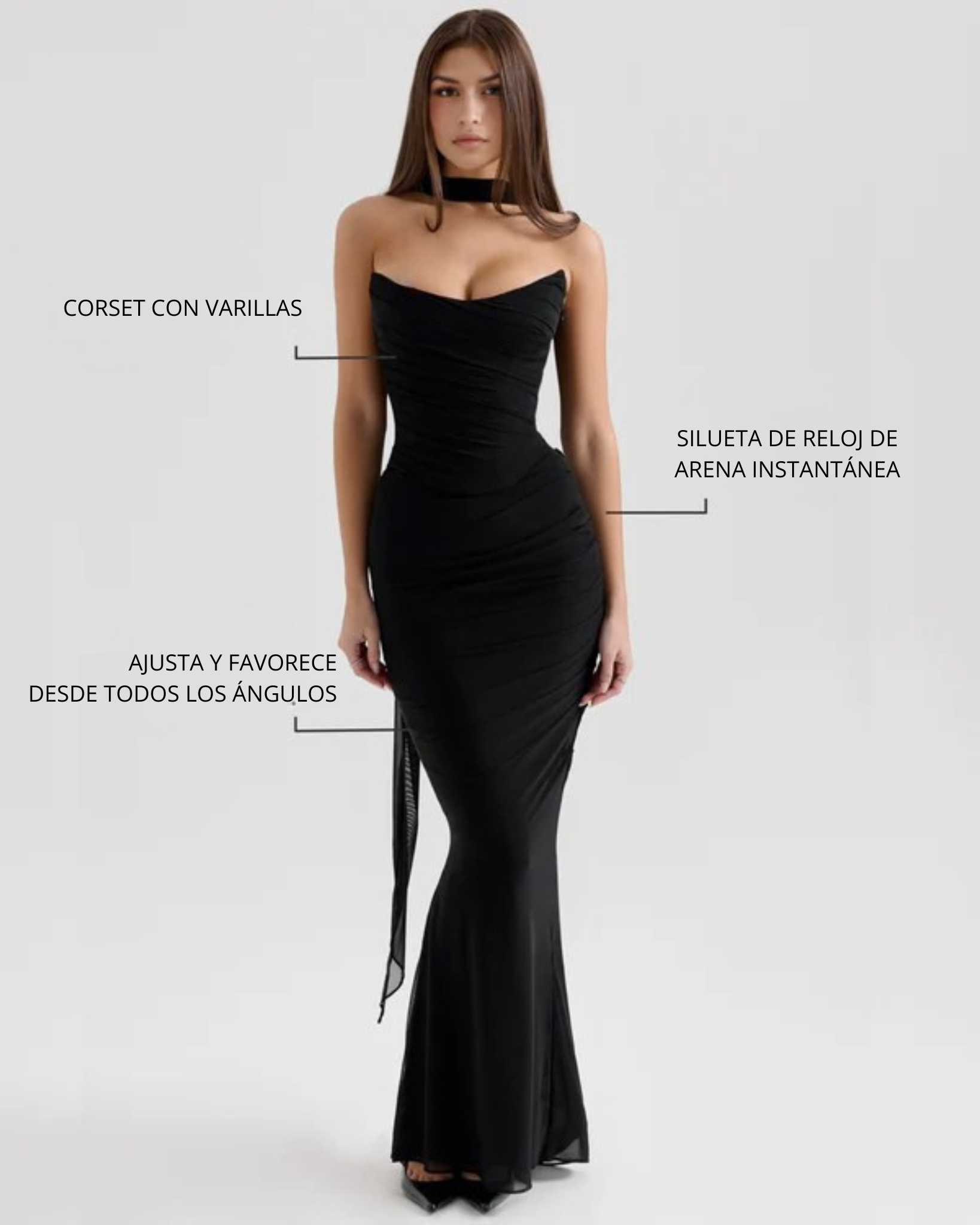 Nuestro conjunto «Malu» reinterpreta la silueta clásica de malla en un diseño moderno de tres piezas: corsé, falda maxi y bufanda a juego. Confeccionado en suave malla elástica, combina la estructura romántica del corsé con la fluidez de la falda fruncida de talle medio y cremallera lateral oculta. La bufanda ligera añade un toque versátil y elegante para un look sofisticado y atemporal.